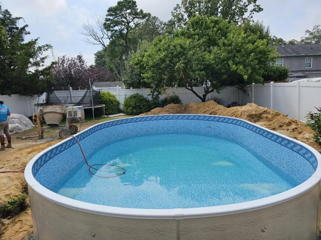 Professional inground and above ground vinyl liner pool installation in NJ, including planning, structural setup, plumbing, and final liner placement.