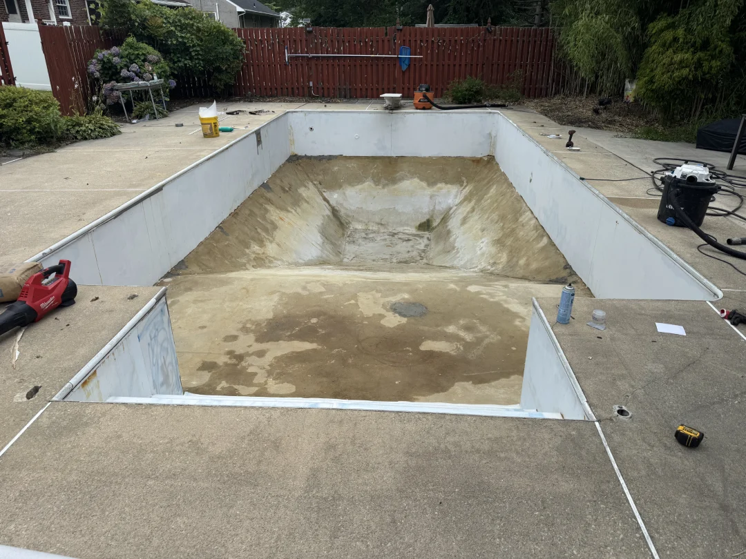 During removal, we inspect the base and wall structure. Minor surface repairs can be completed before the new liner is installed.